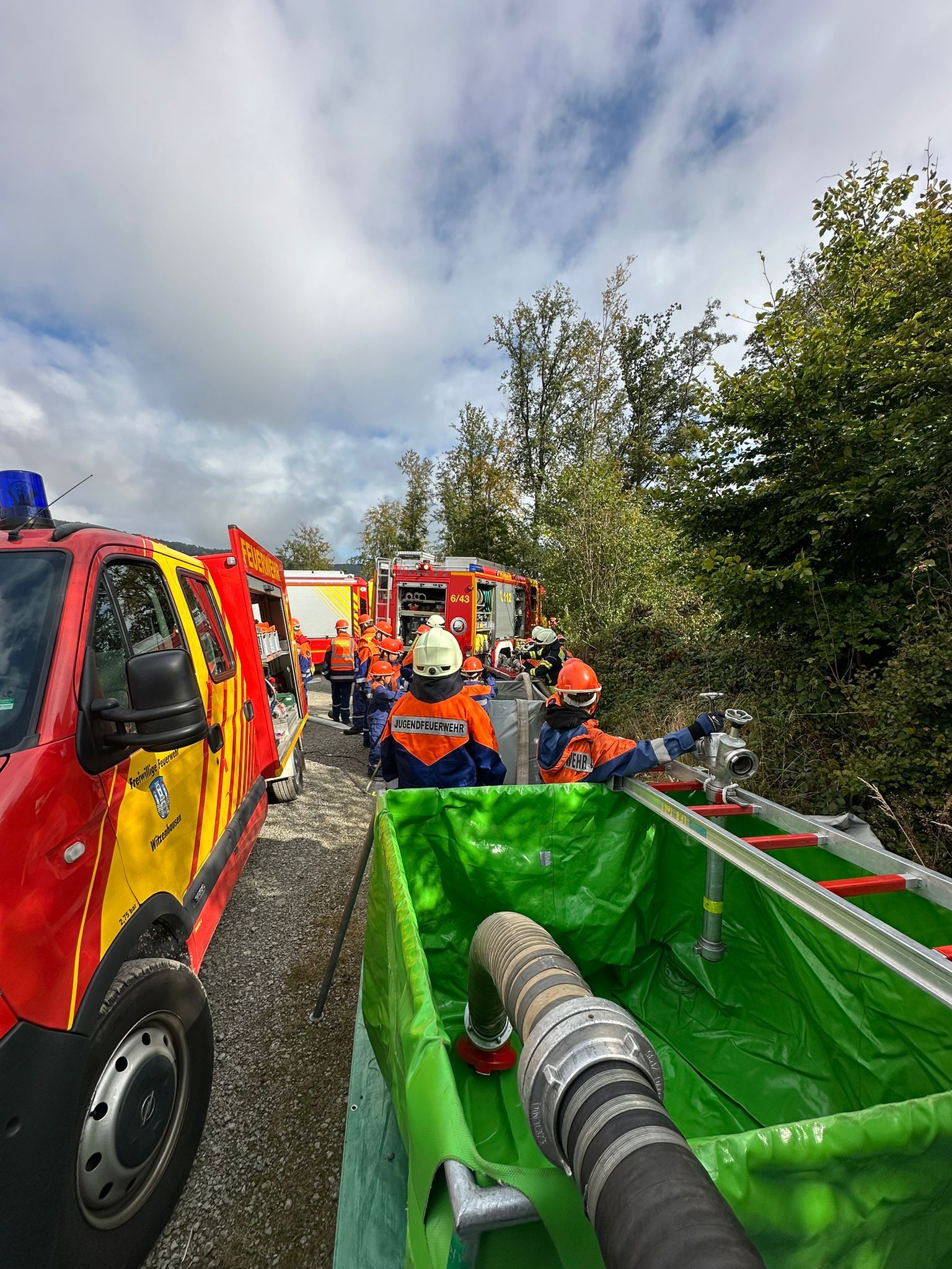 Nun kam die Übung so langsam in Fahrt. Hedemünden fuhr komplett in das besagte Waldstück ein und bauten ihren ersten Löschangriff auf. Kurze Zeit später wurde Gertenbach in den Wald gerufen. Die Aufgabe war, den Wassersack aufbauen und die Wasserleitung von Hedemünden zu verlängern und ebenfalls mit dem Löschangriff beginnen. Das Wasser für Gertenbach kam vom Tanklöschfahrzeug Hedemünden.