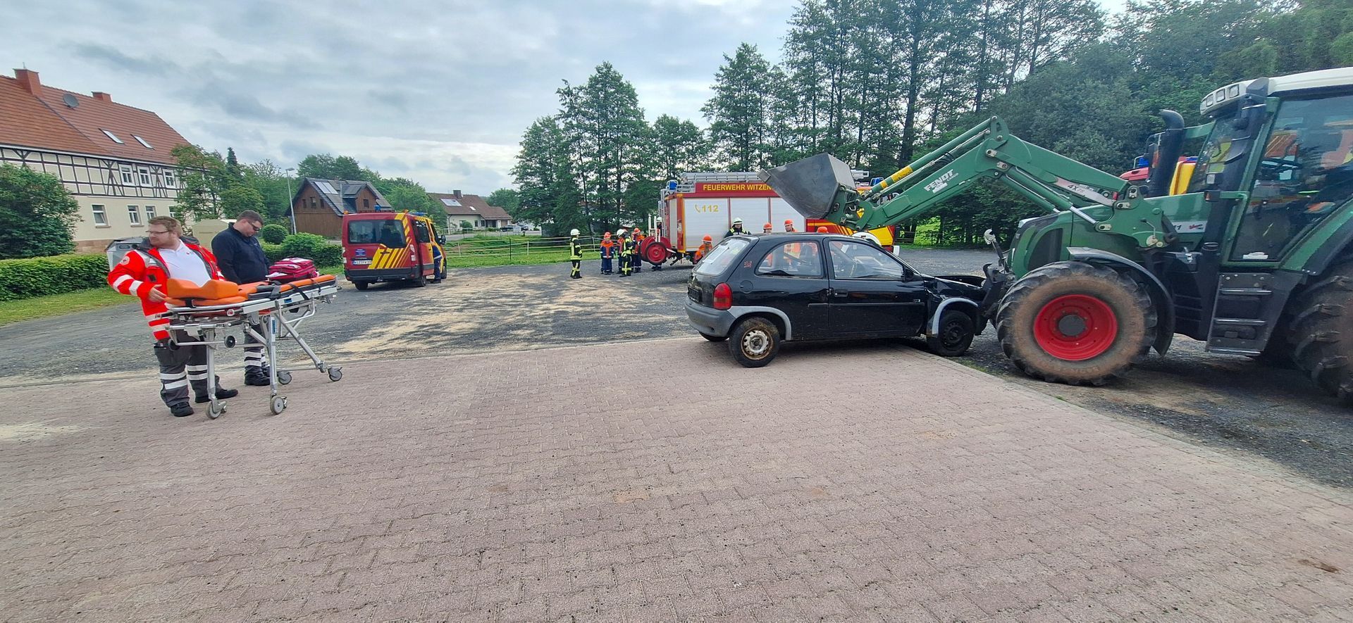 9:00 Uhr. Wieder ein Alarmeingang. Jetzt ging die Fahrt nach Kleinalmerode. Auf dem dortigen Festplatz fanden wir einen weiteren Verkehrsunfall vor. Wieder Trecker via PKW. Aber wir hatten gegenüber zum Vorabend in beiden Fahrzeugen verletzte Personen, die gerettet werden mussten. Also wieder Beurteilung der Situation. Irgendetwas war anders. Bei dem Schlepper war der Frontlader oben und die angebaute Schaufel stand über dem PKW. Würde der Frontlader halten, oder kommt der evtl. runter. Diese Entscheidung nahmen die JF´ler ab, indem sie den Frontlader gegen weiteres absacken gesichert hatten. Vorher durfte auch keiner zum PKW. Nachdem nun die Fahrzeuge gesichert waren, wurde eng mit dem Rettungsdienst die weitere Vorgehensweise besprochen. Da wir zwei RTW vor Ort hatten, war für jedes Fahrzeug ein RTW sowie eine Gruppe da.