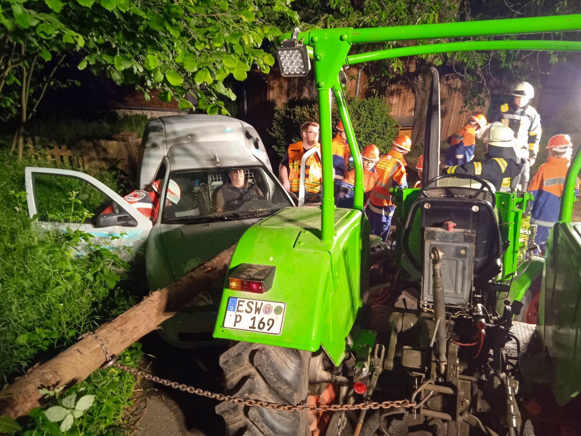 21:15 Uhr Alarm. Technische Hilfeleistung, H1Y. Einsatzort war Blickershausen. Vorgefundene Lage: Trecker gegen Auto, Fahrer vom Auto eingeklemmt und verletzt. Bei dem Unfall wurde ein Baum entwurzelt, der zum Teil auf dem Auto lag.